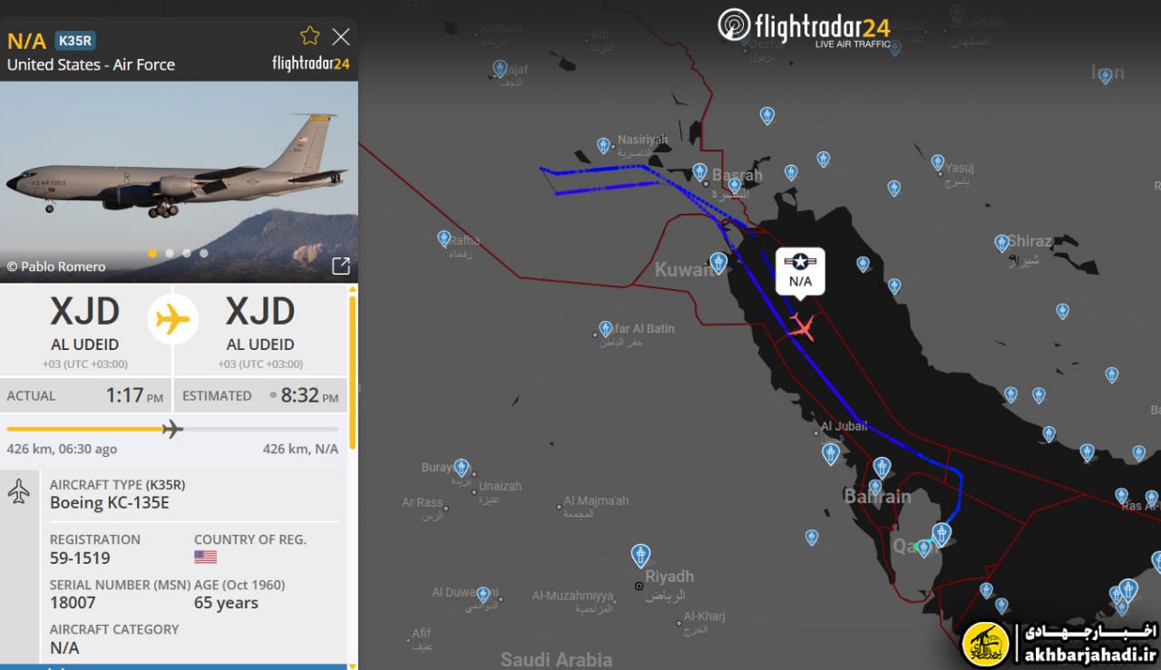 همزمان با اعلام منابع محلی در خصوص شنیده شدن صدای انفجار و شکستن دیوار صوتی در آسمان استان میسان در نزدیکی مرز ایران و عراق، یک فروند هواپیمای سوخترسان Boeing KC-135E ارتش تروریستی آمریکا نیز در حال پرواز بر فراز مناطق جنوبی عراق بوده است. این هواپیما از پرواز العدید قطر به پرواز درآمد و پس از سوخترسانی به جنگندههای اسرائیلی، به این پایگاه بازگشت.